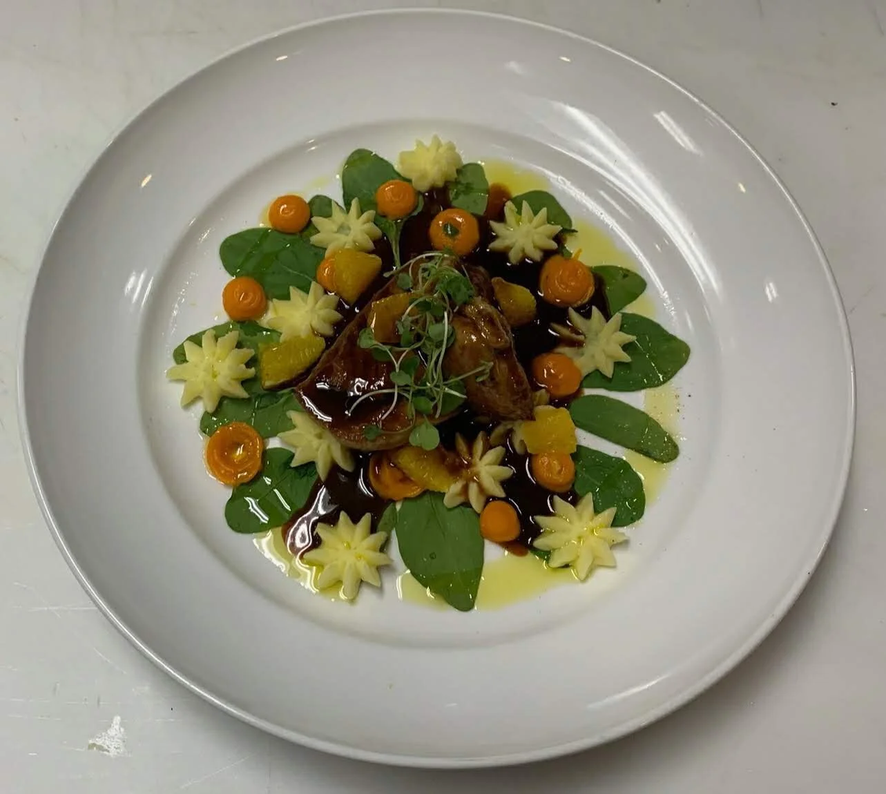 Pan Roasted Duck Breast Marinated in Fresh Corn, Duck Confit, Buckwheat, White Turnips, Cherry Jus