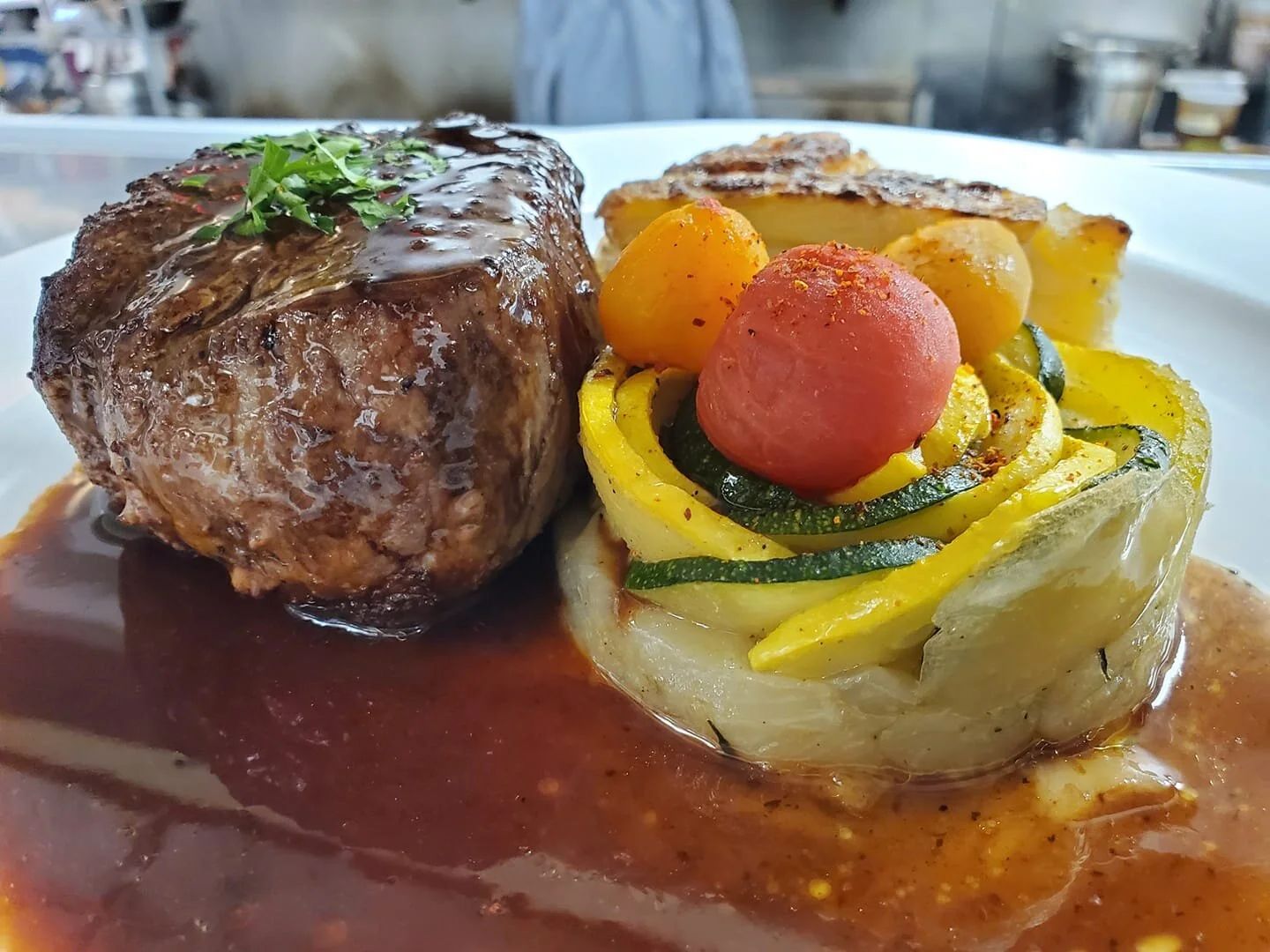 8oz. Pan Seared Prime Filet Mignon, Bone Marrow, Merlot Reduction, Rosemary-Garlic Roasted Potatoes, Asparagus, Carrots