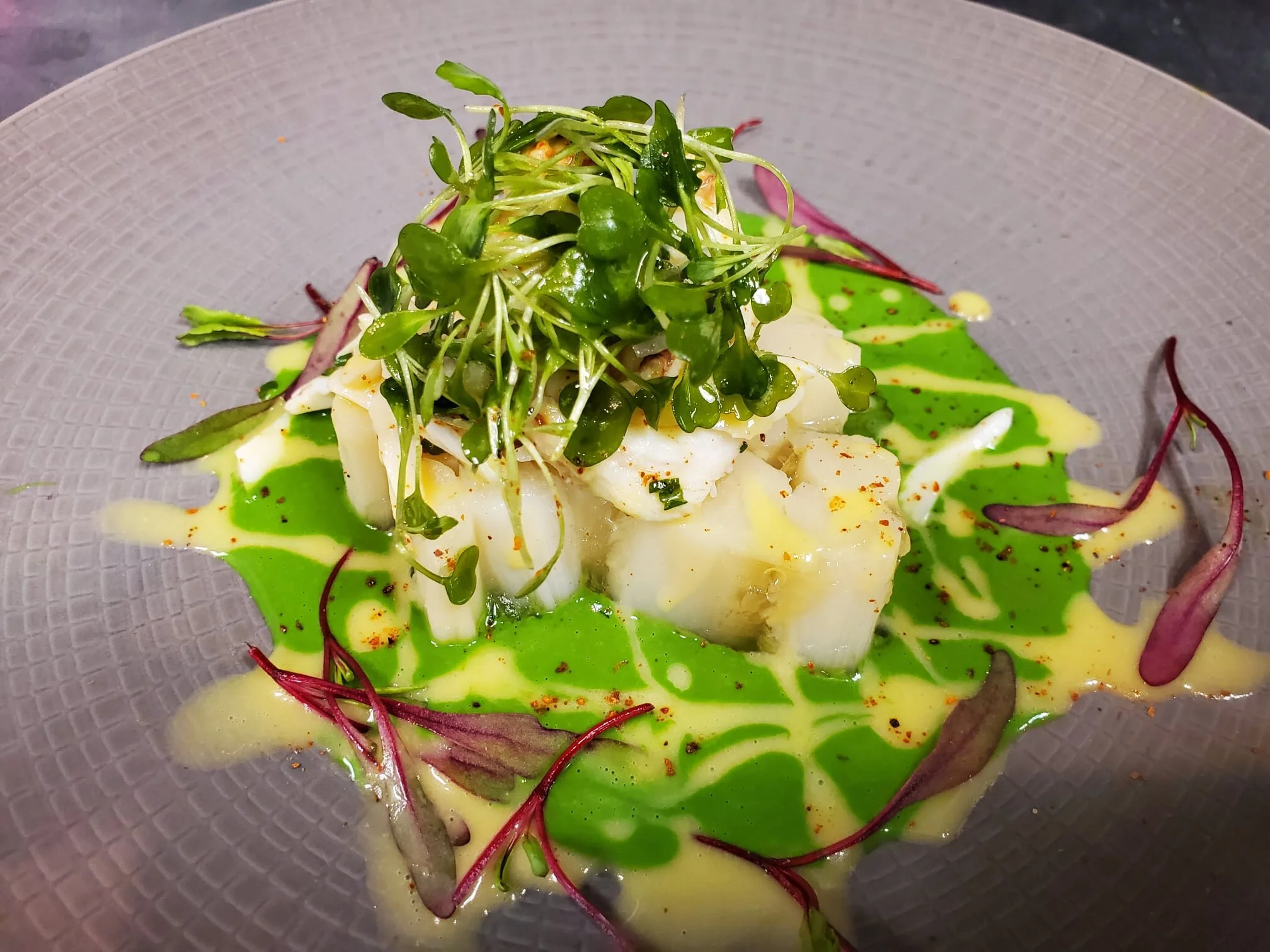 Pan Seared Corvina Fish, Roasted Corn, Jumbo Lump Crab, Light Cream, White Truffle Oil, Asparagus